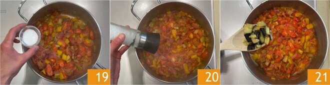 Tempere também com o açúcar 19 e o sal 20. Deixe o vinagre evaporar, depois adicione as berinjelas 21 e continue cozinhando por mais 10 minutos.