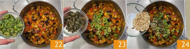 Pouco antes de terminar o cozimento, adicione as azeitonas picadas 22, as alcaparras dessalinizadas 23 e os pinholes tostados 24.