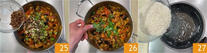 Adicione também as passas, que você terá previamente embebido 25. Uma vez terminado o cozimento, perfuma com manjericão, rasgando as folhas com as mãos 26 e deixe esfriar um pouco. Enquanto isso, coloque o arroz basmati em água fervente salgada 27 e cozinhe pelo tempo indicado na embalagem.