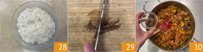 Escorra o arroz e transfira-o para uma tigela grande, depois deixe esfriar um pouco 28. Enquanto isso, pique os filés de anchova 29 e adicione-os à caponata já morna 30.