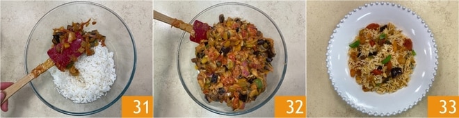 Misture a caponata com o arroz morno 31 e mexa bem 32. Sirva o seu basmati com caponata de legumes decorado com folhas de manjericão fresco 33!