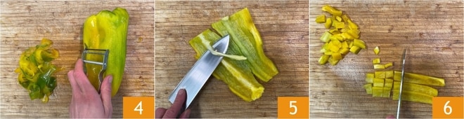 Descasque os pimentões com um descascador de legumes 4, depois remova as sementes e os filamentos internos 5. Corte os pimentões primeiro em tiras e depois em pedaços de cerca de 1,5 cm 6.