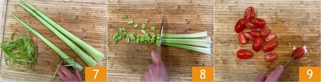 Descasque também os talos de aipo 7 e corte-os em cubos 8. Por fim, corte os tomatinhos ao meio 9.