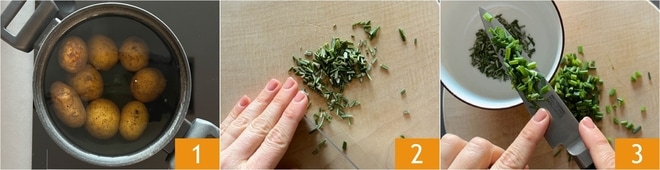 Para preparar as batatas amassadas, primeiro escolha batatas de tamanho semelhante, lave-as e cozinhe-as em água fria por cerca de 35-40 minutos a partir do início da fervura 1. Enquanto isso, derreta a manteiga e deixe esfriar. Agora prepare a emulsão: pique o alecrim 2 e a cebolinha e transfira-os para uma tigelinha 3.