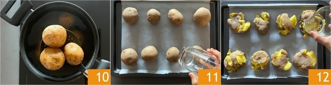 Uma vez cozidas, escorra as batatas 10 e coloque-as em uma assadeira forrada com papel manteiga, espaçando-as umas das outras. Amasse-as delicadamente com o fundo de um copo 11 12.