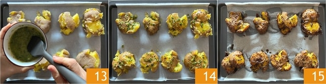 Pincele as batatas amassadas com a emulsão aromática 13 e asse em forno ventilado pré-aquecido a 200° por cerca de 35 minutos 14. Quando estiverem bem douradas, retire do forno e sirva suas batatas amassadas 15!