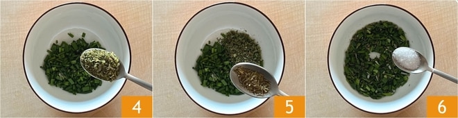 Adicione o orégano 4, o tomilho 5, o sal 6 e a pimenta.