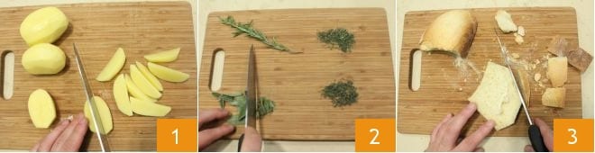 Para preparar as batatas arenosas, descasque as batatas e corte-as em pedaços 1, depois coloque-as em uma tigela com água fria para não escurecerem. Enquanto isso, pique finamente o alecrim e a sálvia 2 e reserve a mistura. Agora pegue o pão, retire a crosta com uma faca 3,