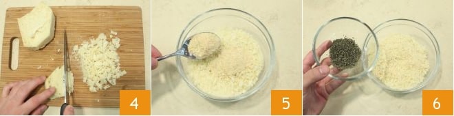 corte grosseiramente o miolo 4 e coloque-o em uma tigelinha, adicione a farinha de rosca 5, a mistura de ervas aromáticas 6