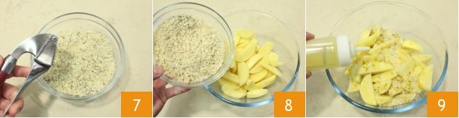 e um dente de alho amassado 7. Agora escorra os pedaços de batata em uma peneira, depois despeje a mistura de miolo e ervas sobre as batatas 8, tempere com um fio de azeite de oliva 9,