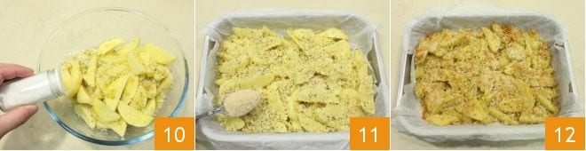 sal 10 e pimenta a gosto. Misture os pedaços de batata e coloque-os em uma assadeira forrada com papel manteiga previamente umedecido e bem torcido para aderir melhor à assadeira, por último, cubra as batatas com uma colher de farinha de rosca 11. Asse as batatas arenosas em forno estático a 180° por 40 minutos (se for forno ventilado a 160° por 30 minutos) e depois passe-as ao grill por 5 minutos. Após o cozimento, suas batatas arenosas estarão douradas e crocantes 12, retire-as do forno e deixe esfriar um pouco antes de servir.