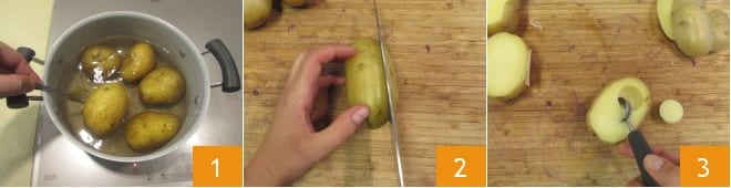 Para preparar as batatas assadas com maçãs, laranjas e Grana Padano, comece cozinhando as batatas por cerca de 30 minutos 1. Uma vez cozidas, sem descascá-las, retire a tampa 2, esvazie-as com uma colher de chá ou um boleador 3, deixando cerca de 1 cm de borda.