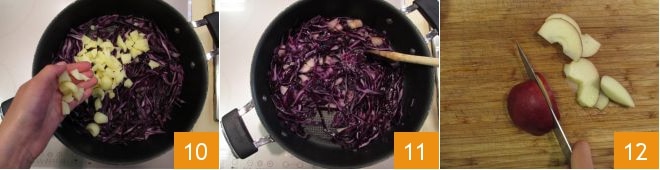 Adicione também metade da polpa das batatas 10. Misture 11, salgue a gosto e tempere também com orégano e alecrim. Cozinhe por cerca de 10 minutos, mexendo frequentemente. Prepare o restante do tempero cortando as maçãs primeiro em fatias finas 12 e depois em pedaços menores.