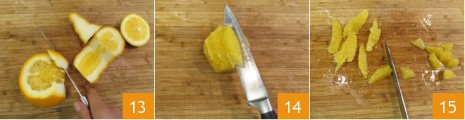 Descasque a laranja 13, divida-a em gomos 14 e corte-os ao meio 15.