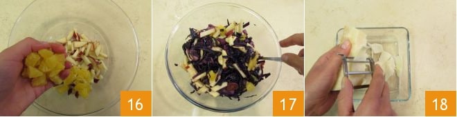 Adicione a laranja às maçãs em uma tigela 16, acrescente também o repolho morno, a polpa restante das batatas, tempere com a pimenta de Sechuan moída na hora. Misture bem 17. Obtenha lâminas finas de Grana Padano DOP 18