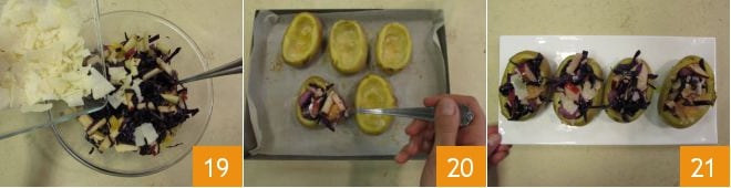 e adicione-as ao restante do tempero 19. Recheie as cascas das batatas com a salada 20 e decore com orégano fresco e alecrim a gosto. Suas batatas assadas com maçãs, laranjas e Grana Padano estão prontas para serem saboreadas 21.
