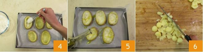 Uma vez esvaziadas, coloque-as em uma assadeira forrada com papel manteiga e polvilhe a base interna com o Grana Padano DOP ralado 4. Tempere com um fio de azeite 5 e asse em forno estático pré-aquecido por 25 minutos a 200°. Depois, coloque no grill por mais 5 minutos. Enquanto isso, prepare o recheio: pique a polpa das batatas 6.