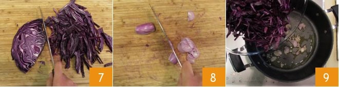 Corte o repolho em fatias finas 7, limpe e fatie finamente também a cebola 8 e refogue-a por 2-3 minutos em uma frigideira com um fio de azeite. Depois, adicione também o repolho 9.