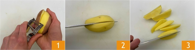 Para preparar as batatas e abobrinhas na panela, primeiro descasque as batatas 1, depois divida-as ao meio 2. Corte cada metade em 4 fatias 3.