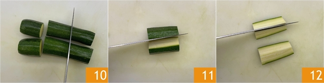 Enquanto isso, prepare as abobrinhas: corte as extremidades e divida em 3 ou 4 partes, dependendo do comprimento 10. Corte cada peça ao meio 11, depois divida cada metade em 4 fatias 12.