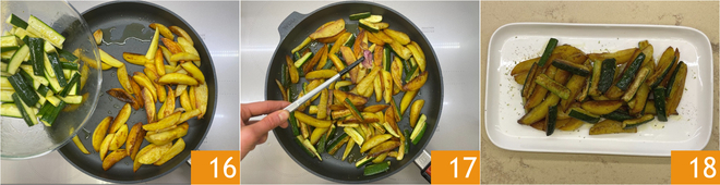 Após os 25 minutos de cozimento das batatas, adicione também as abobrinhas 16 e doure tudo em fogo médio por mais 7-10 minutos, ou até que as abobrinhas estejam cozidas. Descarte os dentes de alho 17 e sirva suas batatas e abobrinhas na panela decoradas com mais uma pitada de pimenta e hortelã 18!