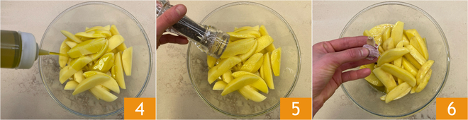 Transfira as fatias de batata para uma tigela e tempere com óleo 4, sal, pimenta 5 e 2 dentes de alho com casca 6.