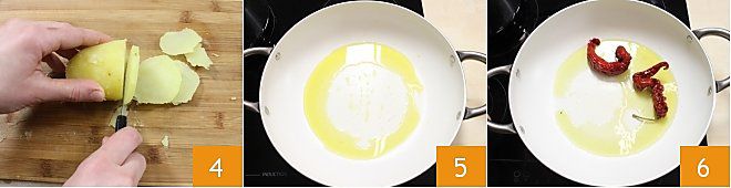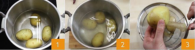 Para preparar as batatas e pimentões cruschi, comece fervendo as batatas por 10 minutos 1 (serão suficientes 5 minutos se você usar uma panela de pressão) para que amoleçam, mas não desmanchem 2. Descasque as batatas 3
