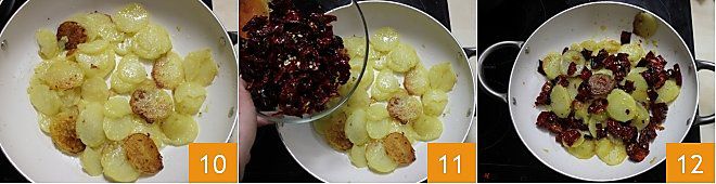 Escorra os pimentões cruschi em uma bandeja coberta com papel toalha 7. Corte os pimentões cruschi em pedaços não muito pequenos 8 e reserve-os. Agora, cozinhe as fatias de batatas em fogo alto na mesma frigideira e no mesmo óleo de cozimento dos pimentões 9.