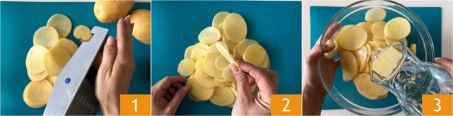 Para preparar as batatas na airfryer, lave bem as batatas. Fatie-as finamente com a ajuda de um mandolim 1, sem descascá-las, de forma a obter uma espessura de cerca de 3 mm 2. Distribua-as em uma tigela e cubra com água fresca 3.