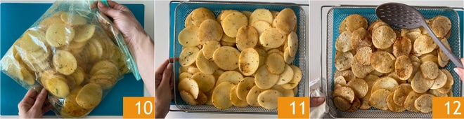 Agite novamente o saco para distribuir os aromas 10. Despeje as batatas na cesta da airfryer 11 e cozinhe a 230° por cerca de 30 minutos. Na metade do tempo, verifique se estão douradas na superfície e agite delicadamente a cesta 12. Se necessário, borrife com um pouco de óleo.