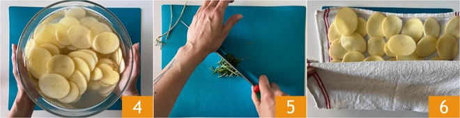 Deixe de molho por cerca de 20 minutos 4. Enquanto isso, lave o alecrim e pique finamente as folhas 5. Escorra bem as chips de batatas e seque-as com 2 panos limpos 6.