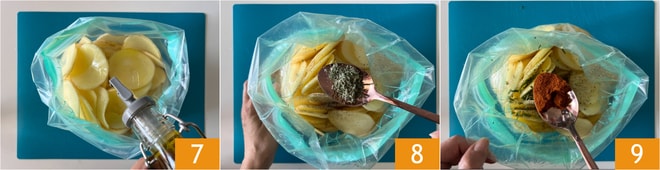 Distribua-as em um saco plástico para alimentos, borrife com um pouco de óleo 7 e agite bem o saco, depois aromatize com as ervas 8 e as especiarias 9.