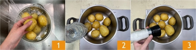Para preparar as batatas na panela de pressão (com casca) a primeira coisa a fazer é lavá-las bem 1. Em seguida, transfira-as para dentro da panela de pressão de 4,5L e adicione os 250 g de água 2. Acrescente também uma pitada de sal 3. É importante que as batatas não se sobreponham e permaneçam ligeiramente espaçadas entre si.