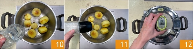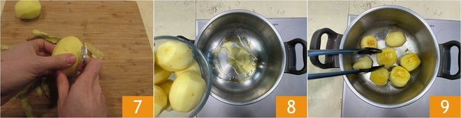 Para preparar as batatas na panela de pressão (sem casca), despeje na panela de pressão de 4,5L um fio de óleo abundante e deixe aquecer em fogo médio-baixo. Descasque as batatas 7, coloque-as na panela de pressão 8 e doure bem todos os lados 9. Bastarão alguns minutos.