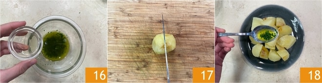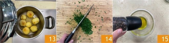 Uma vez cozidas, desligue o fogo. Levante a válvula para que todo o vapor contido na panela de pressão saia rapidamente (faça esta operação com cuidado para não se queimar). Assim que a panela não estiver mais sob pressão e a válvula de controle abaixar, você poderá abrir a tampa 13 e transferir as batatas para um recipiente. Cuide do tempero, primeiro pique finamente a salsinha 14, depois em uma tigela coloque o óleo, o sal e a pimenta 15.
