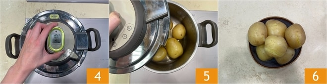 Feche bem com a tampa da panela de pressão, feche a válvula 4 e acenda em fogo médio-alto. Assim que ouvir o primeiro apito, sinal de que a panela está sob pressão, cozinhe em fogo médio-baixo por 10 minutos. Desligue o fogo, levante a válvula para liberar o vapor (sempre tenha cuidado para não se queimar). Assim que a panela não estiver mais sob pressão e a válvula de controle baixar, você poderá abrir a tampa 5. Retire as batatas sem se queimar 6 e use como preferir!