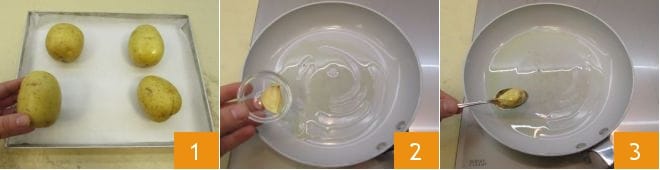 Para preparar as batatas assadas recheadas, comece lavando e secando bem os tubérculos. Recomendamos escolher batatas do mesmo tamanho para obter posteriormente uma cocção uniforme. Disponha as batatas em uma assadeira forrada com papel manteiga 1. Asse em forno estático pré-aquecido a 190°C por cerca de 1 hora (o tempo de cocção depende do tamanho das batatas; para regular melhor, teste a cocção espetando as batatas com um palito de dente). Enquanto isso, aqueça em uma frigideira o azeite com o dente de alho descascado 2; uma vez que o alho tiver aromatizado o azeite, retire-o 3