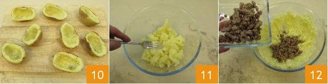 Depois de escavar todas as batatas 10, amasse a polpa com um garfo 11 para obter um purê. Adicione a carne refogada 12, sal e pimenta.