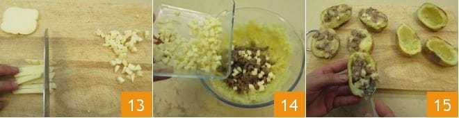 Corte o provolone em cubos 13 e adicione ao recheio 14, misture para integrar os ingredientes. Agora recheie suas batatas com o recheio usando uma colher 15