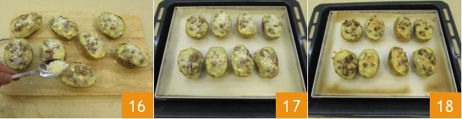 Tempere as batatas com o queijo ralado 16, depois coloque-as em uma assadeira forrada com papel manteiga 17 e leve ao grill por 5 minutos para dourar a superfície 18. Sirva suas batatas assadas recheadas bem quentes!