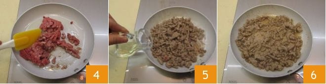 e adicione a carne moída 4, amasse-a para desmanchar e refogue por cerca de 10 minutos, depois adicione o vinho branco 5 e, uma vez evaporado o álcool, apague o fogo e reserve 6.