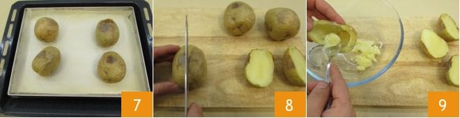 Quando as batatas estiverem assadas (certifique-se de que estão macias espetando-as com um palito de dente), retire-as do forno 7, deixe esfriar um pouco, depois corte-as ao meio no sentido do comprimento 8. Com uma colher, retire a polpa da batata, deixando uma borda de cerca de meio centímetro 9 e coloque em uma tigela.