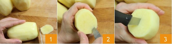Para preparar as batatas recheadas da vovó Franca, comecem descascando as batatas. Em seguida, cortem ambas as extremidades 1, para que as batatas fiquem na posição vertical sozinhas. Depois, com uma faquinha, façam um corte ao longo do perímetro interno das batatas, deixando 3-4 milímetros de borda 2 e façam um corte também no centro da polpa 3, para facilitar a extração.