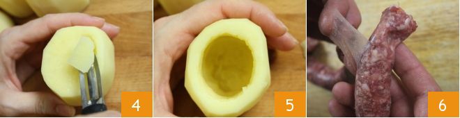 Sempre com uma faquinha, um utensílio para cavar ou um descascador de legumes, removam a polpa interna 4, mas sem furar o fundo 5. Uma vez que todas as batatas estejam cavadas, coloquem-nas em uma tigela e cubram com água, assim elas não ficarão escuras. Agora dediquem-se à preparação dos ingredientes do ragù: cortem a salsicha e desfaçam-na em uma tigelinha 6.