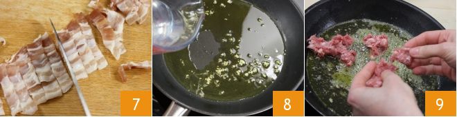 Depois, coloquem o bacon defumado em uma tábua e cortem-no primeiro em tiras e depois em cubinhos 7. Descasquem um dente de alho e piquem-no finamente, depois despejem um pouco de azeite de oliva em uma frigideira e, uma vez quente, refoguem o alho picado por alguns minutos, depois deglacem com um pouco de água ou caldo de legumes 8. Para descobrir como prepará-lo da melhor forma, consultem nossa Escola de culinária: Caldo de legumes. Quando o líquido evaporar, adicionem a salsicha desfeita 9.