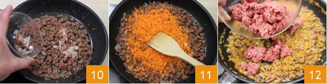 Continuem adicionando o bacon defumado em cubinhos 10 e mexam com uma colher de pau para desfazer bem a carne. Em seguida, adicionem a mistura de cenoura e cebolinha fresca 11 e deixem cozinhar em fogo médio-alto por 5 minutos. Depois, despejem uma concha de caldo de legumes e adicionem também a carne moída 12.