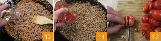 Mexa para desfazer a carne e deglace com o vinho branco seco. Despeje uma colher de sopa de extrato de tomate em uma tigelinha e dissolva-o com um pouco de caldo, depois adicione-o ao ragù em cozimento 14. Enquanto isso, corte os tomatinhos em quartos 15.