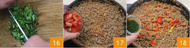 Forme uma mistura bem fina de manjerona, tomilho, alecrim e salsa 16, depois adicione os tomatinhos cortados em quartos e as ervas aromáticas picadas no ragù (17-18).