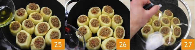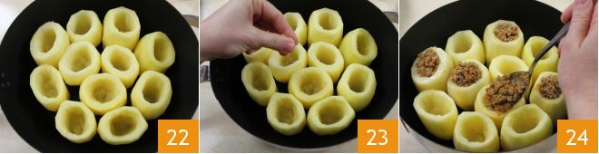 Neste ponto, você pode escorrer as batatas, secá-las com papel toalha e posicioná-las uma ao lado da outra em uma frigideira larga, adequada também para cozimento no forno 22. Salgue-as por dentro uma a uma 23 e recheie com o ragù até a borda 24, serão suficientes 2-3 colheres de sopa por batata.