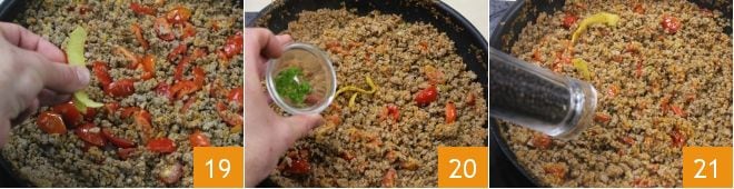 Adicione a casca de meio limão 19 e a pimenta verde picada e sem sementes 20. Tempere com sal e pimenta a gosto 21 e deixe o ragù cozinhar por pelo menos 30 minutos. Quando estiver seco, retire as cascas de limão e ajuste o sal e a pimenta, se necessário.